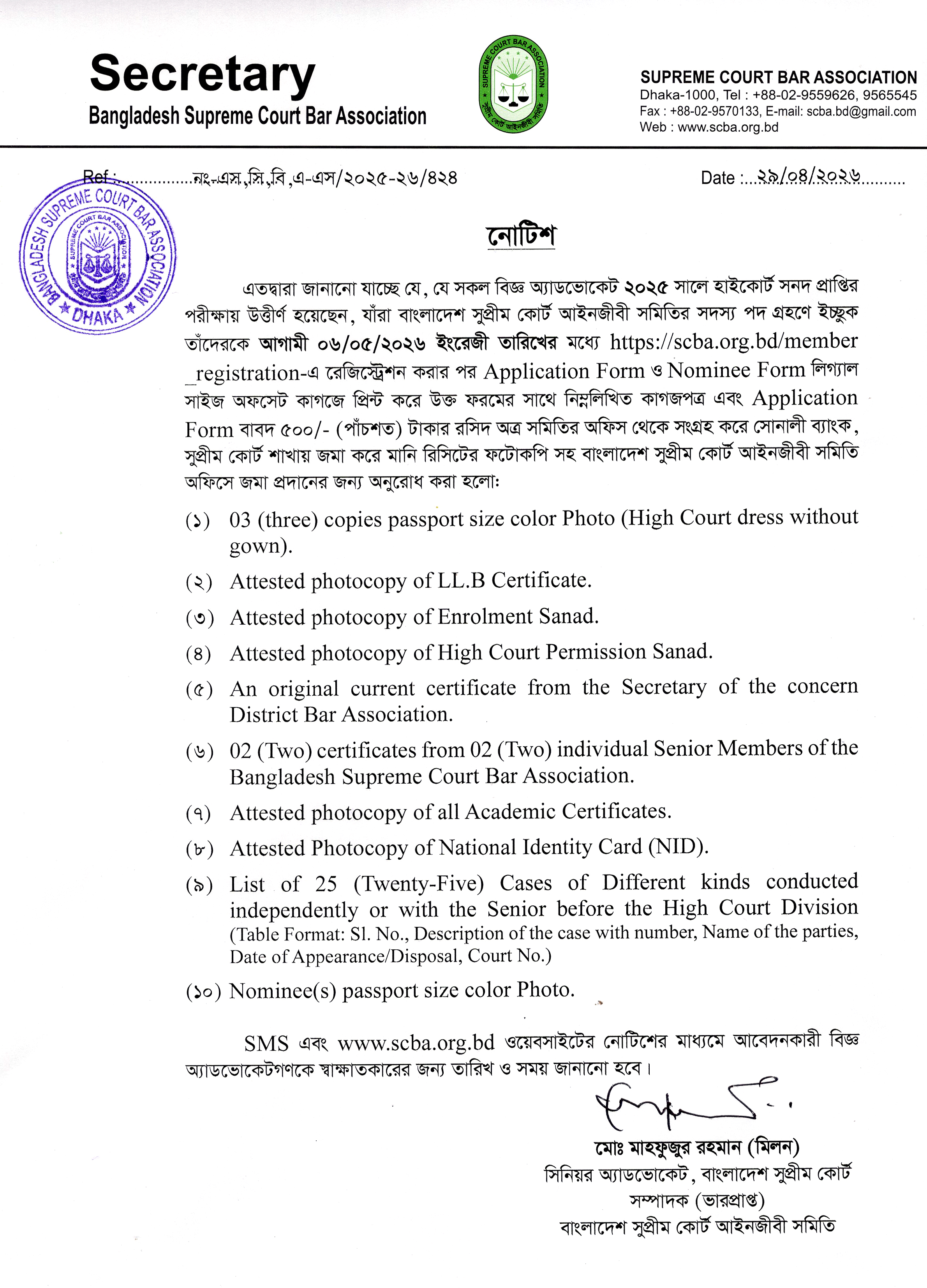 Message From the Secretary (Acting)It is a great pleasure on my part as Secretary, Bangladesh Supreme Court Bar Association to see the website. As an integral part of the Global Village we feel proud of being attached with the device..... Read More