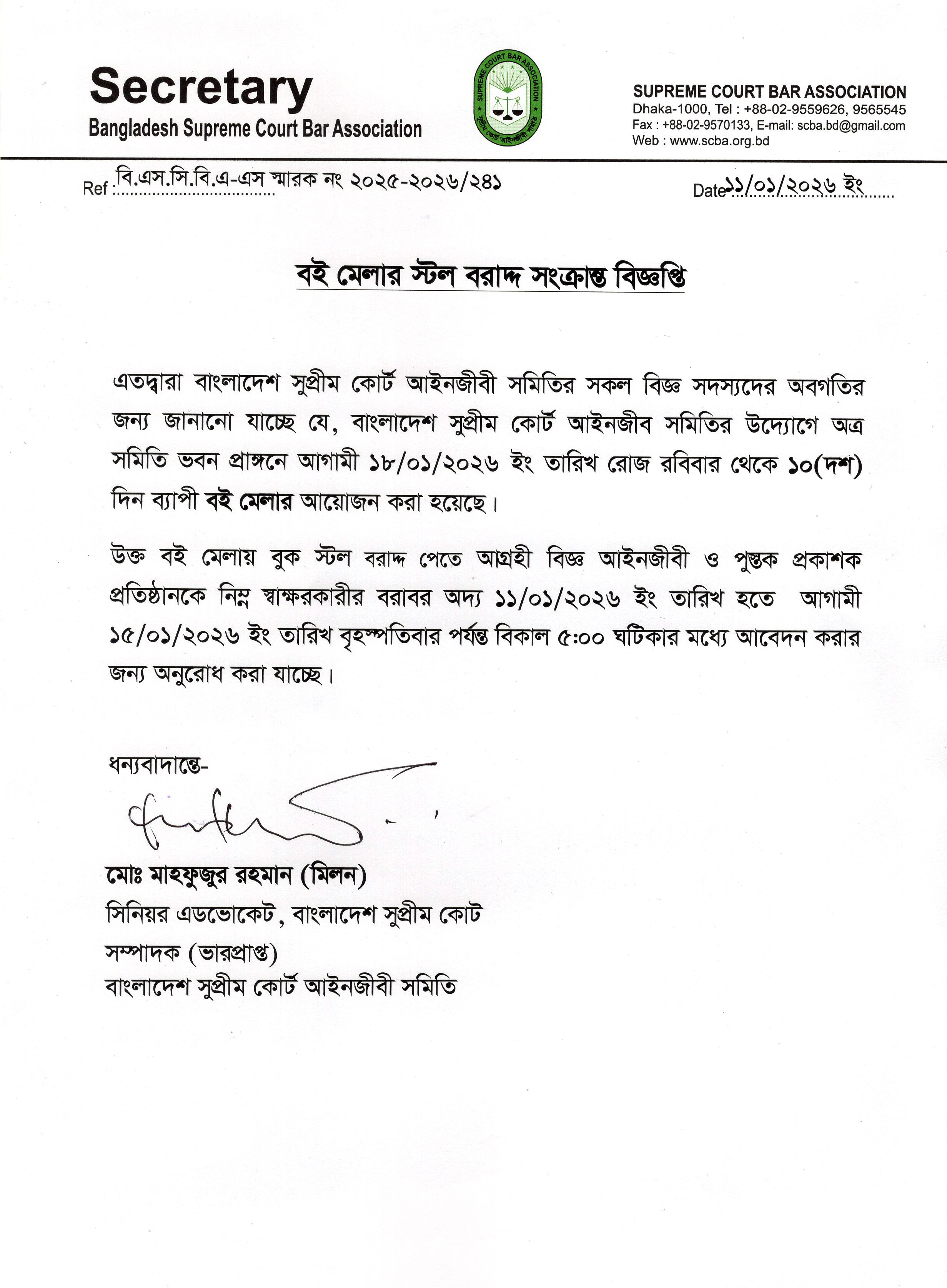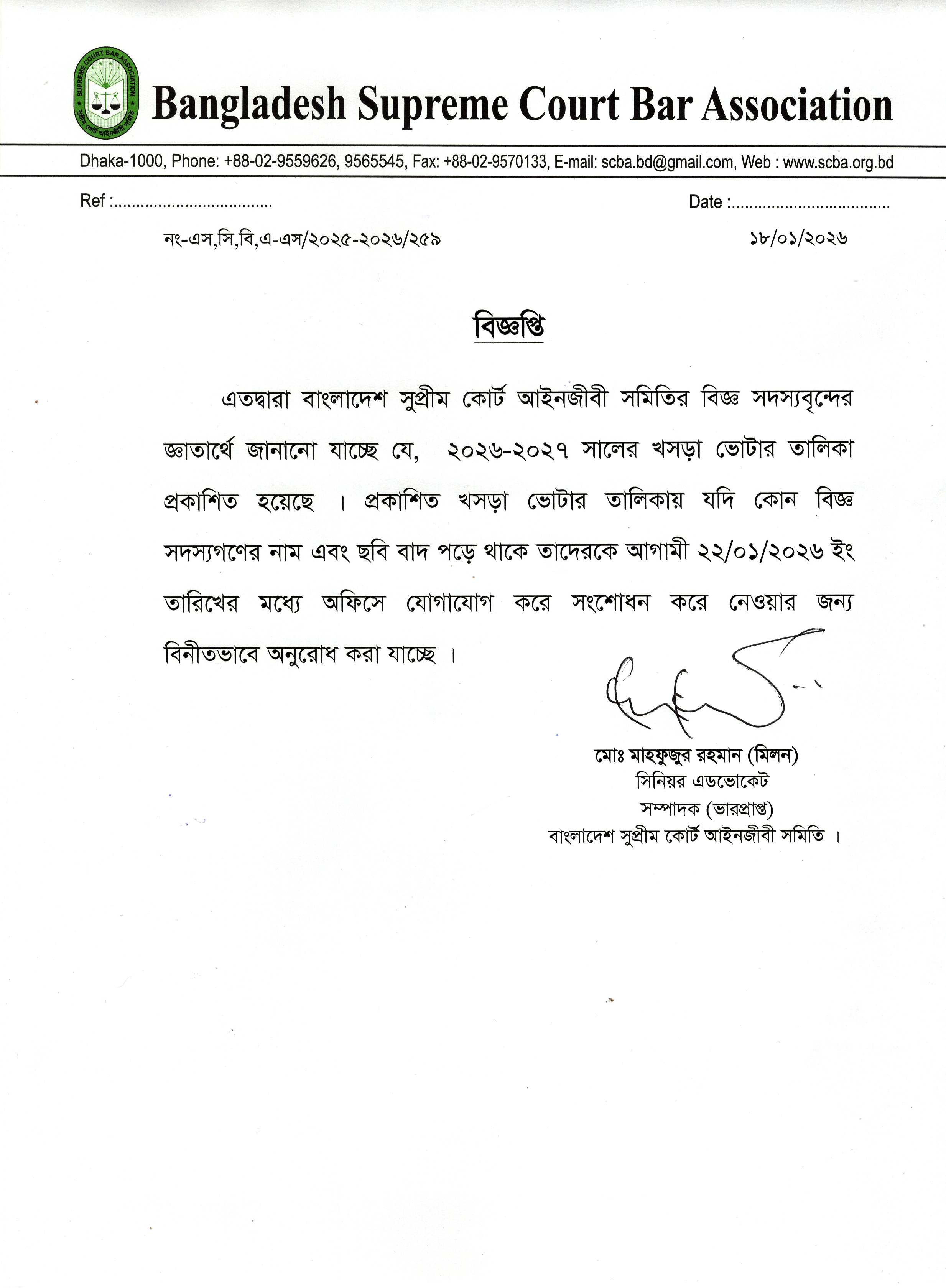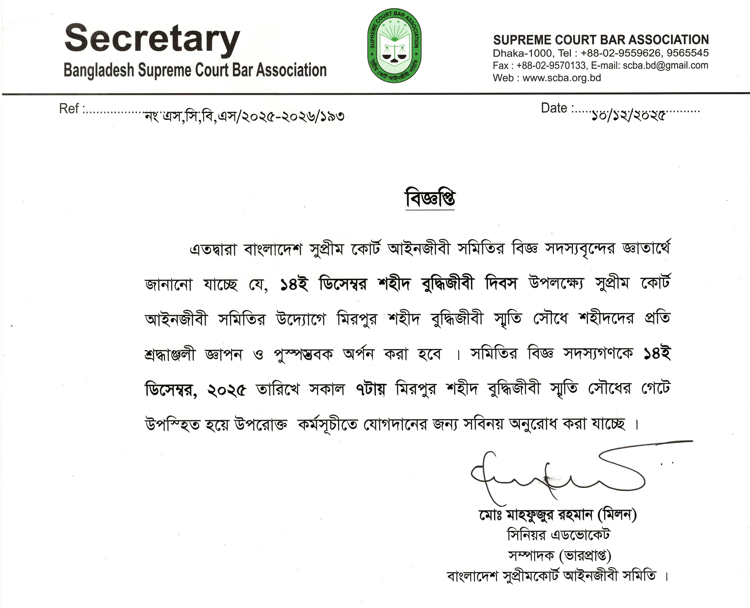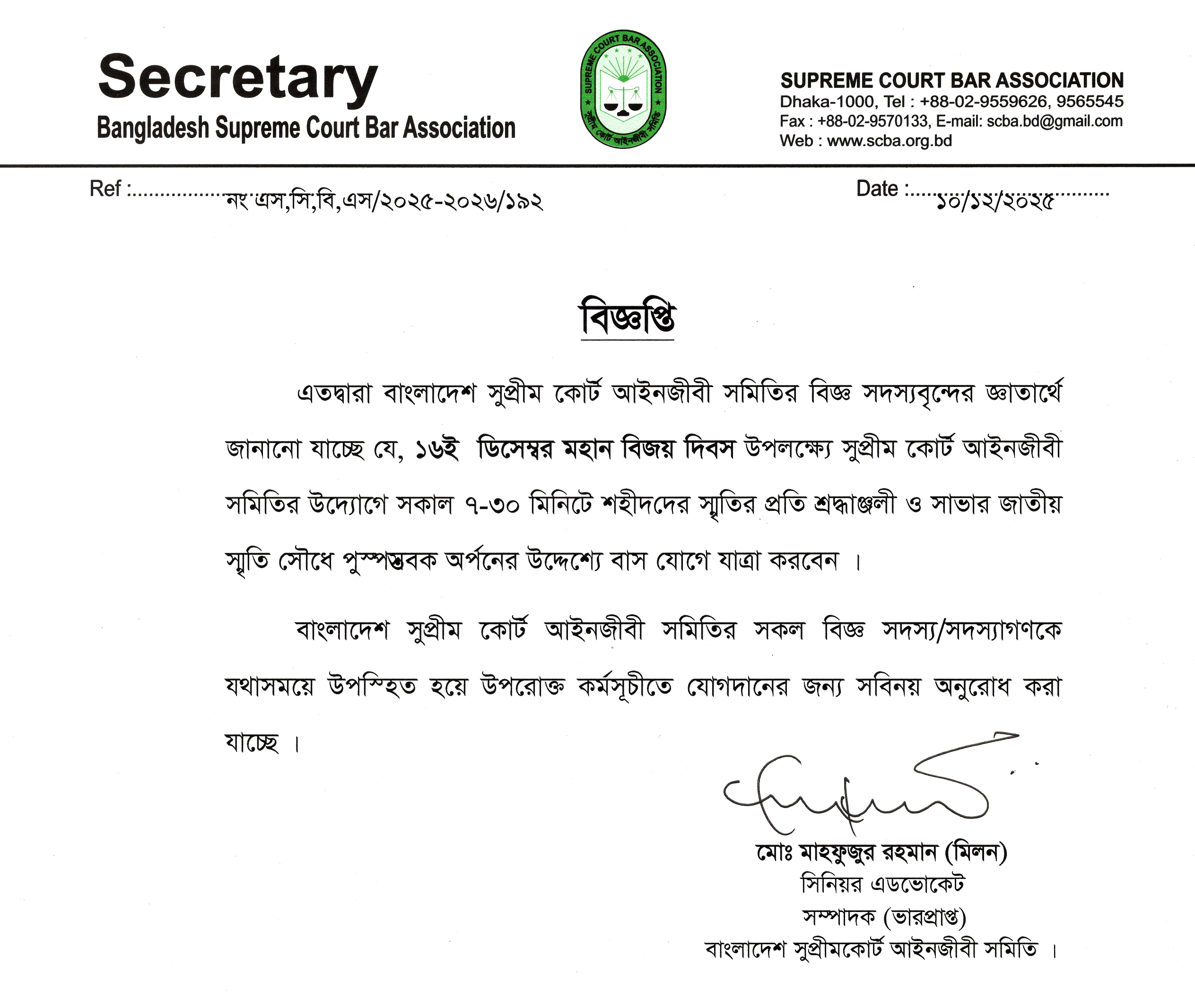 Message From the SecretaryIt is a great pleasure on my part as Secretary, Bangladesh Supreme Court Bar Association to see the website. As an integral part of the Global Village we feel proud of being attached with the device..... Read More