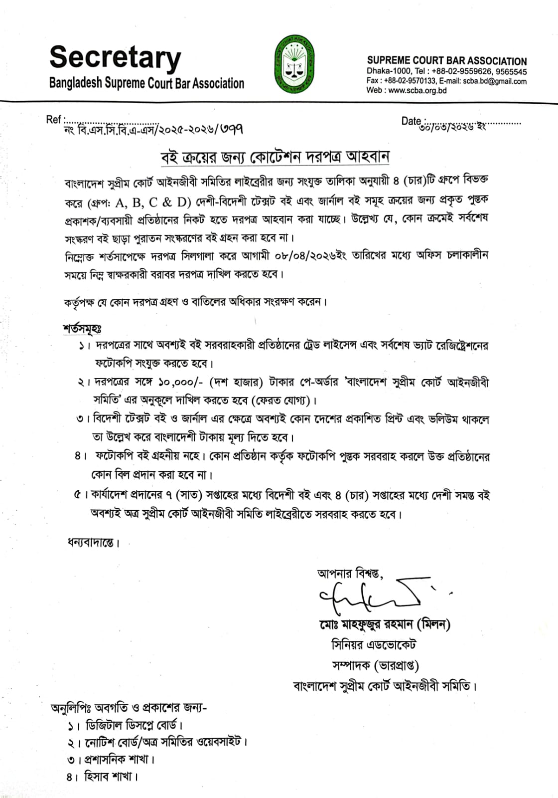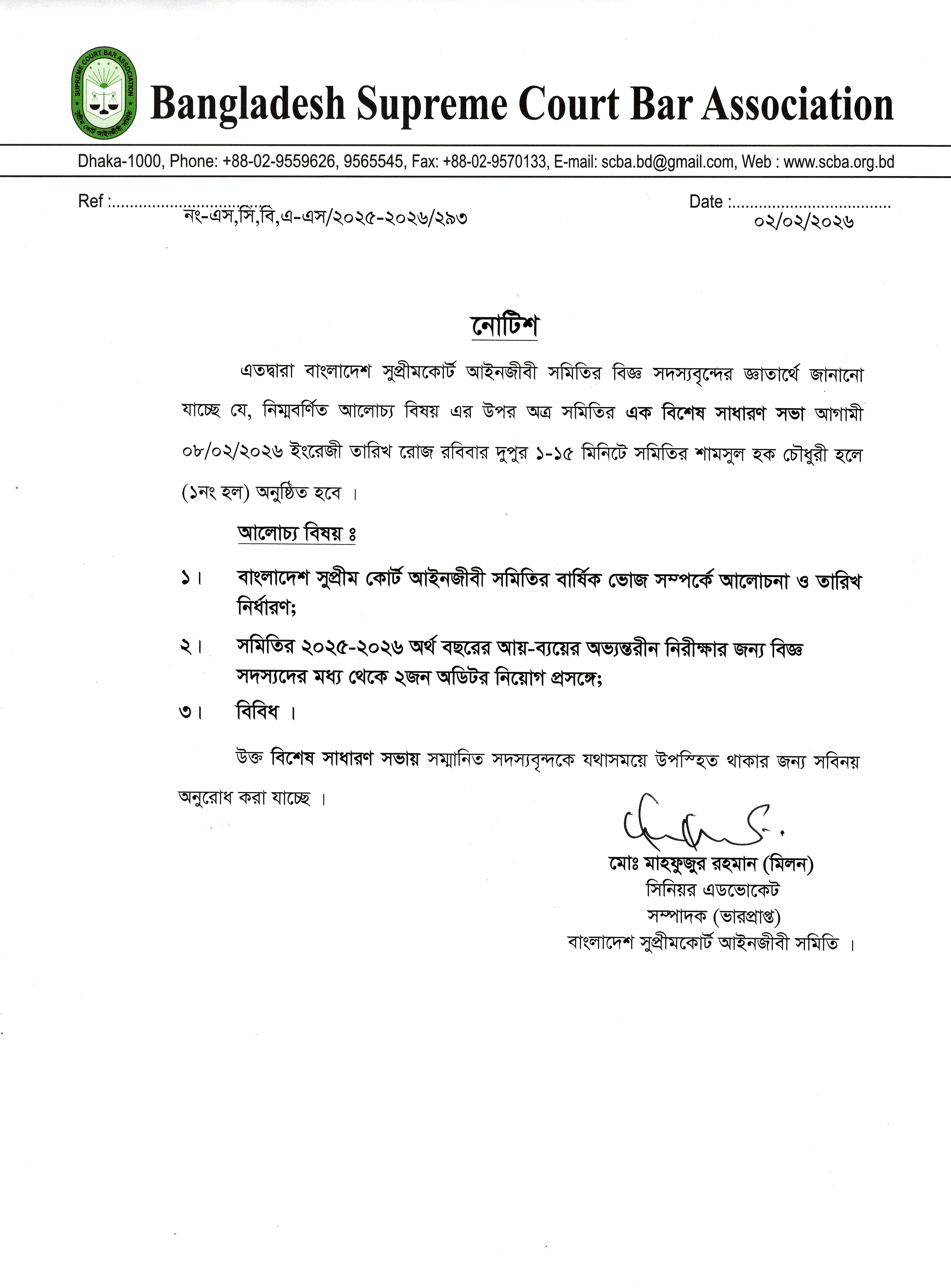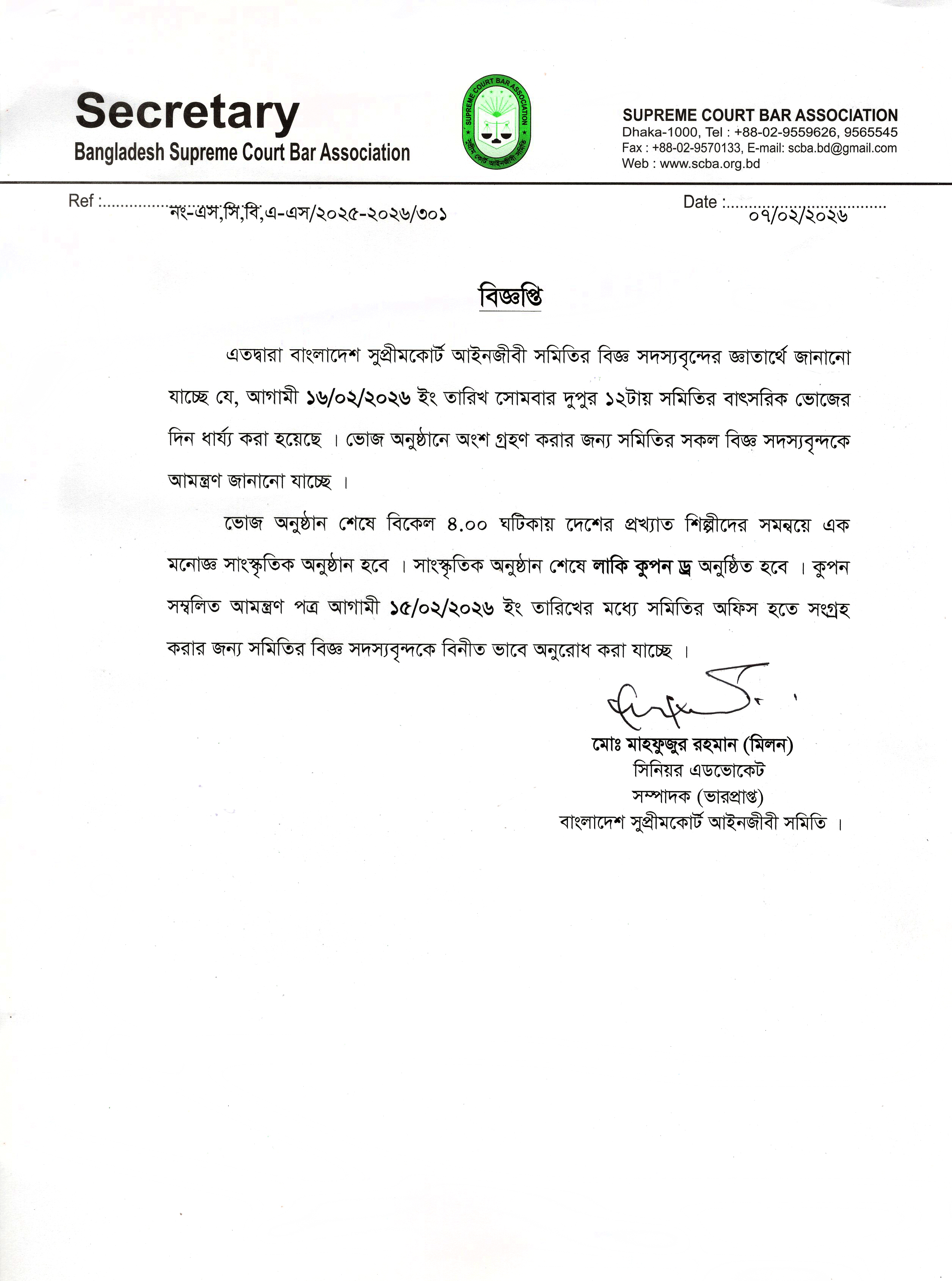 Message From the Secretary (Acting)It is a great pleasure on my part as Secretary, Bangladesh Supreme Court Bar Association to see the website. As an integral part of the Global Village we feel proud of being attached with the device..... Read More
